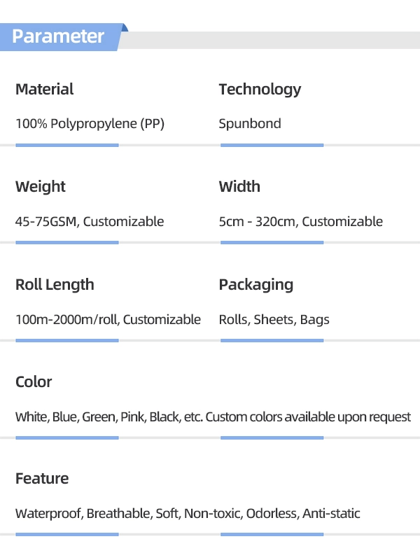 Универсальные приложения в различных отраслях Благодаря своей универсальности эта ткань является лучшим выбором для многих отраслей. медицинская сфера, он является основным материалом для производства одноразовых хирургических халатов, масок, простыней и бахил благодаря своим превосходным барьерным свойствам и стерильности. розничная торговля и упаковка, он широко используется для изготовления многоразовых сумок для покупок, защитных упаковочных материалов и подарочной упаковки. Сельскохозяйственное Профессионалы используют его для укрытия сельскохозяйственных культур и тканей для борьбы с сорняками, в то время как ремесло и DIY Сообщество отдает ему предпочтение за простоту использования в таких проектах, как скрапбукинг, декор дома и создание цветочных композиций.